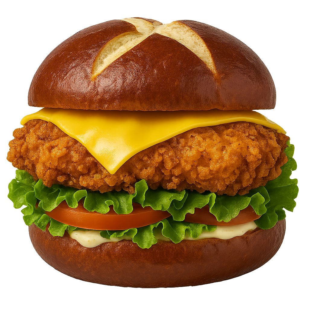 Chicken fillet with a honey honey glaze layered with cheese, lettuce, pickles topped with burger sauce